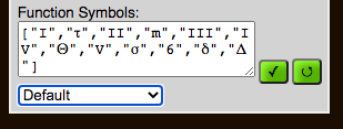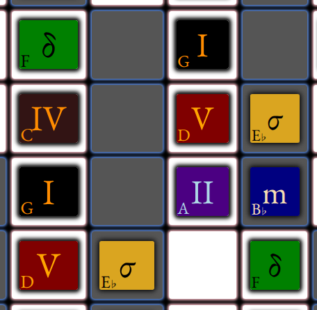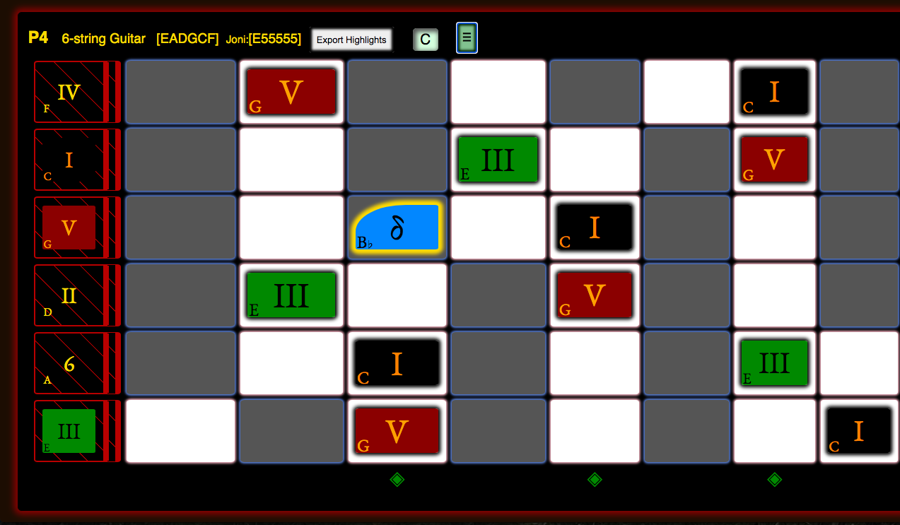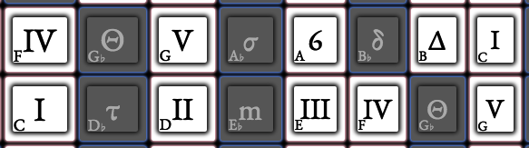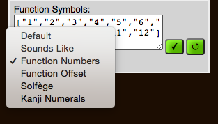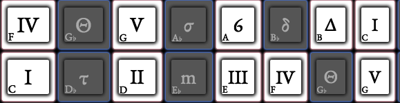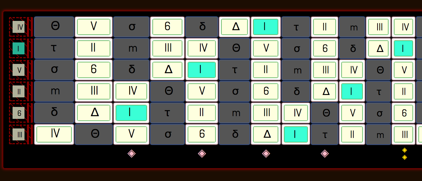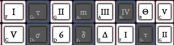 | Note Functions | What a note functions as. For example, in the key of C, the note G functions as "the Five" (or "V"). The function is where a note sits in the mode or scale you are playing. So if the band switches to the key of A, that G note becomes the dominant seven, because we count from A up seven scale-tones. This would be the case if we were playing in A Mixolydian. If we were in A major, the mode has G# as the major seven, so the G is a flatted G#--that is, not in the major mode. infinite-neck deals with this by assigning a unique symbol to each Note Function: a dominant seven is δ and a major seven is Δ. |