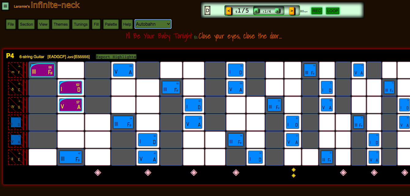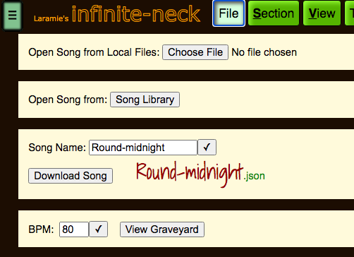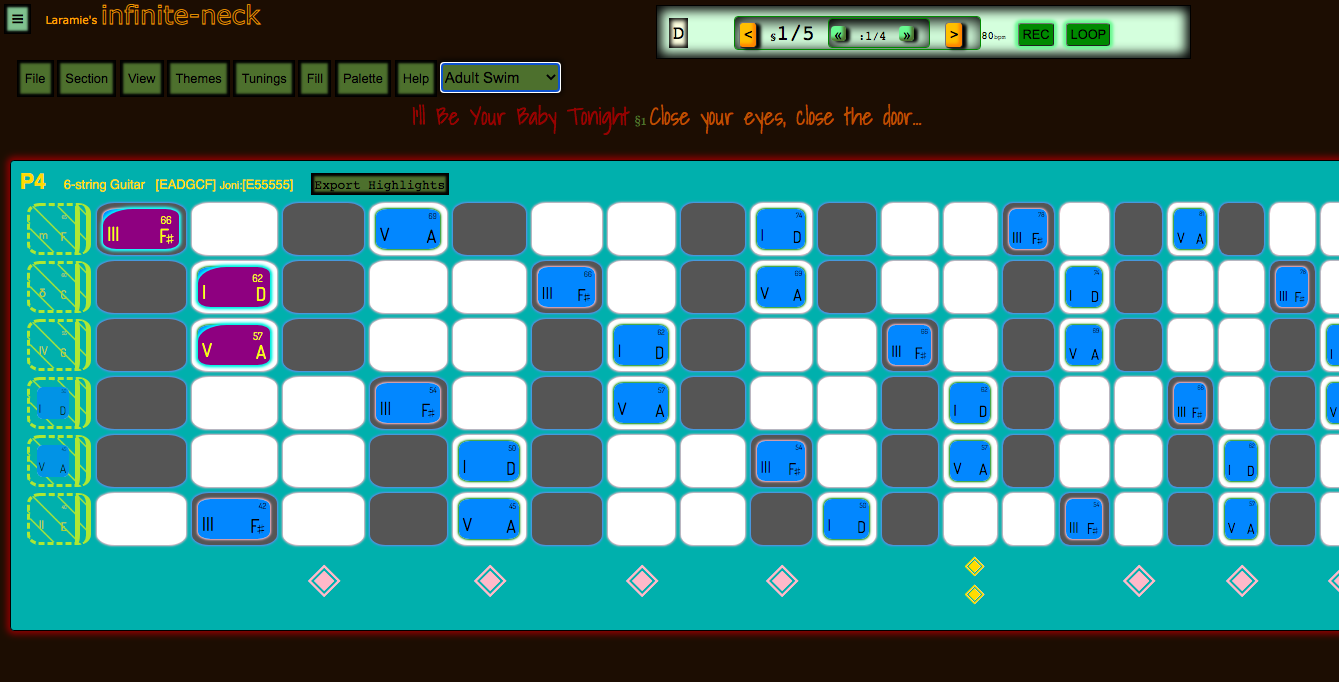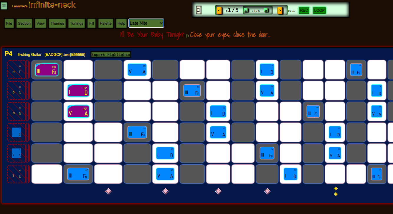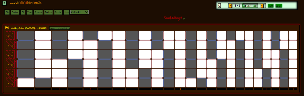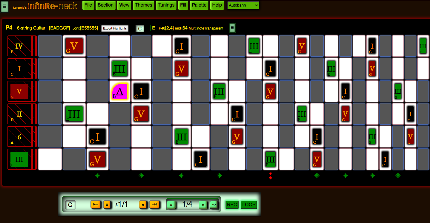 | Theme | A collection of styles, shapes, and sizes for the display of the instrument neck. There are built-in Themes that you can select for a song using the dropdown in the main menu row of buttons. (Or, you can select different Themes for any Section if you save the DisplayOptions for that Section.) You can tweak the Theme to your liking using the Themes Menu. Advanced users can define their own by editing the JSON text file themes.js. |