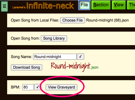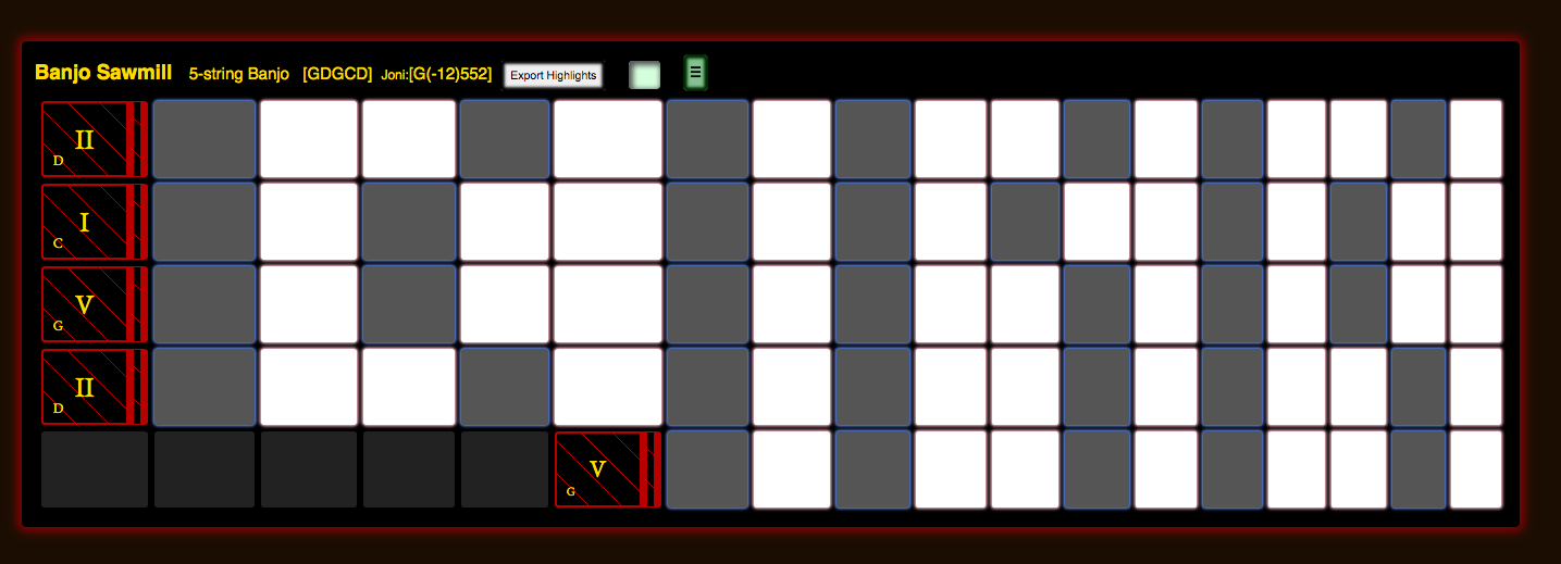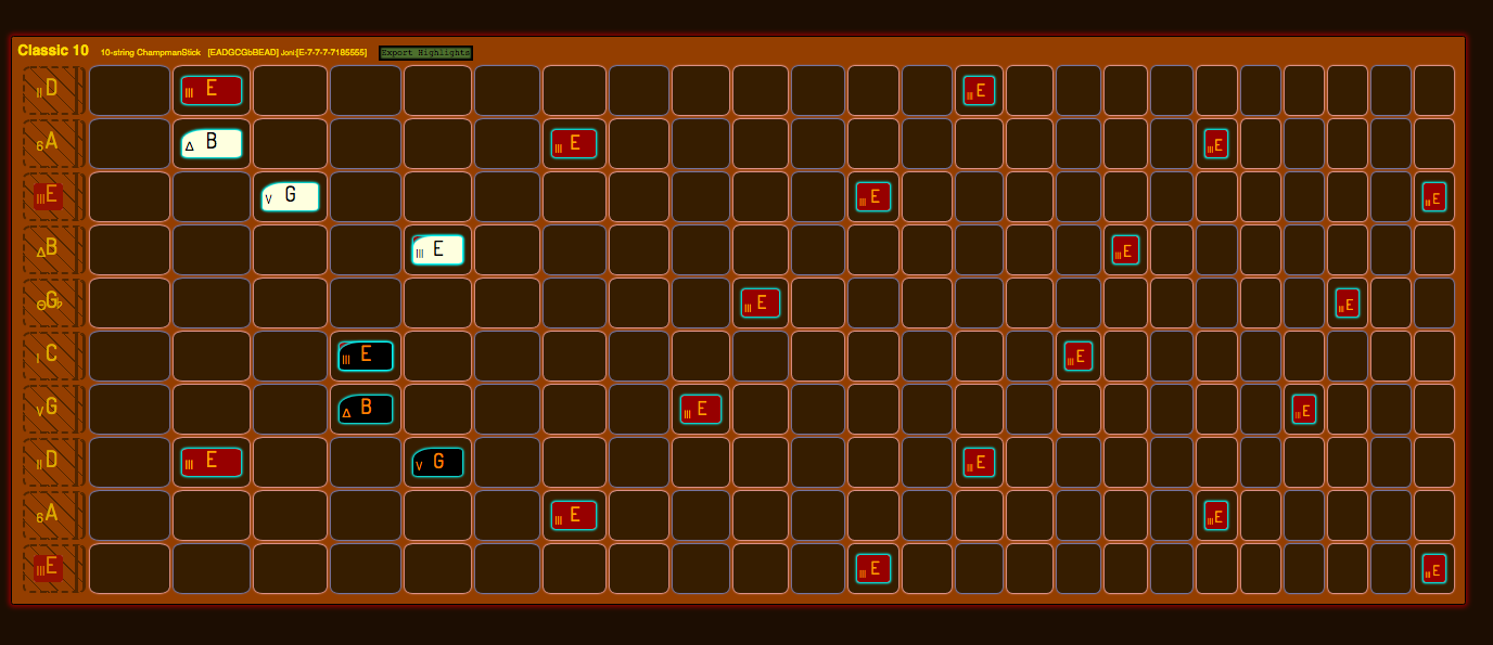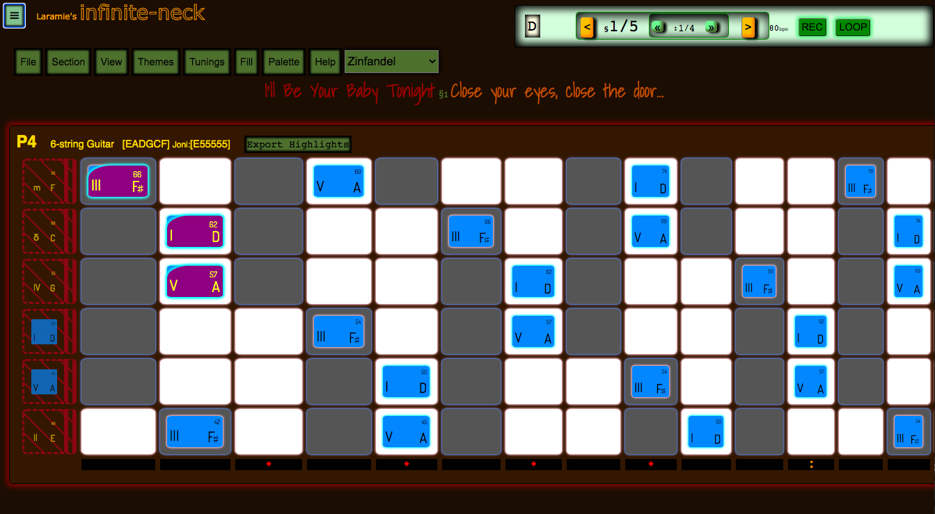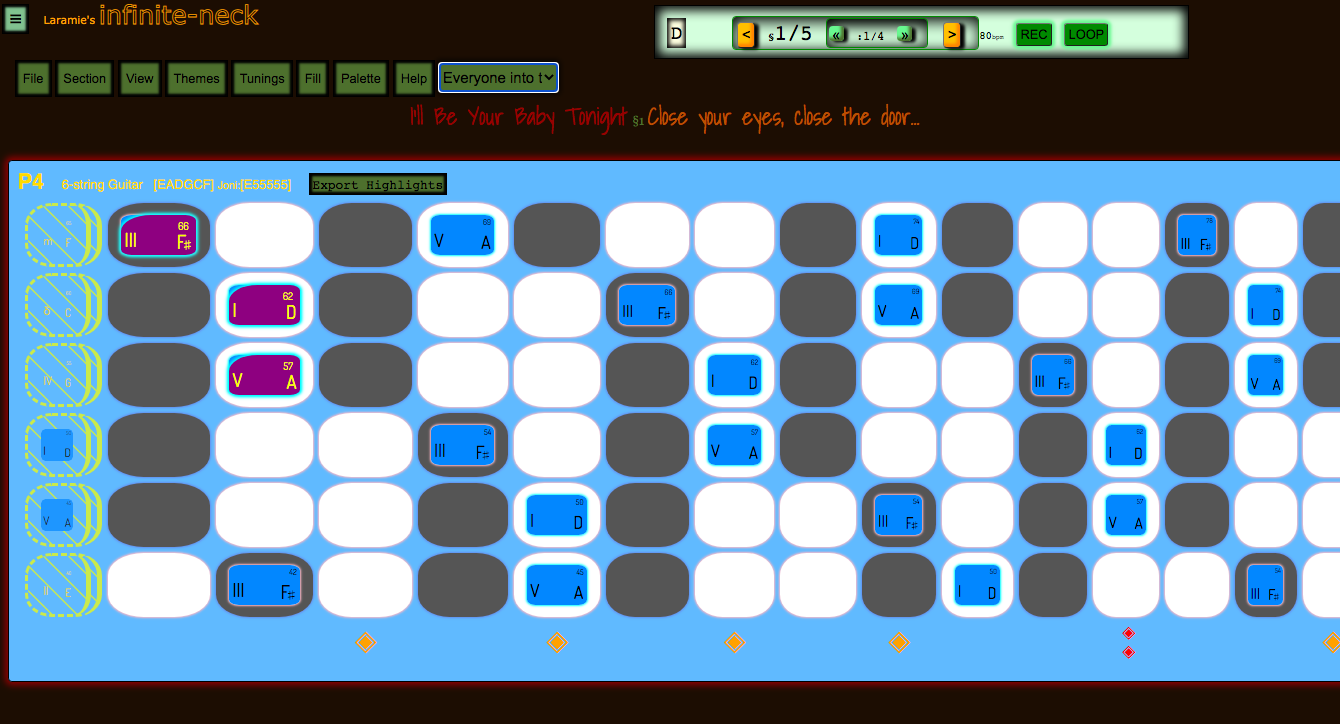 | Theme | A collection of styles, shapes, and sizes for the display of the instrument neck. There are built-in Themes that you can select for a song using the dropdown in the main menu row of buttons. (Or, you can select different Themes for any Section if you save the DisplayOptions for that Section.) You can tweak the Theme to your liking using the Themes Menu. Advanced users can define their own by editing the JSON text file themes.js. |