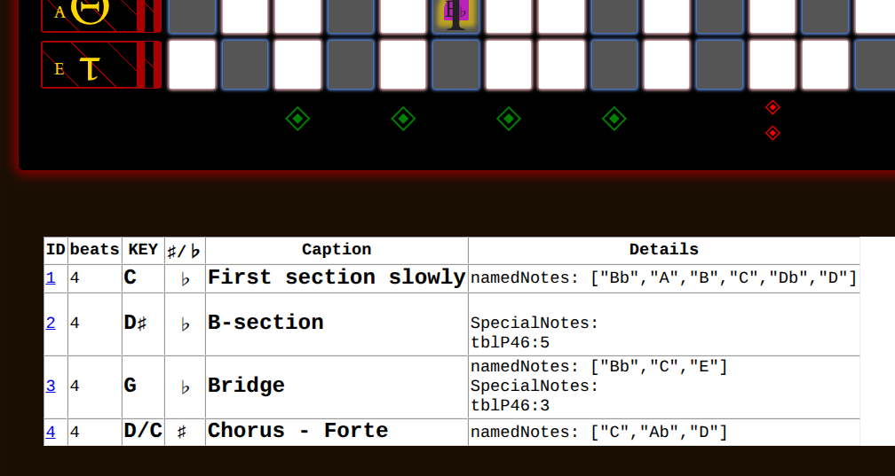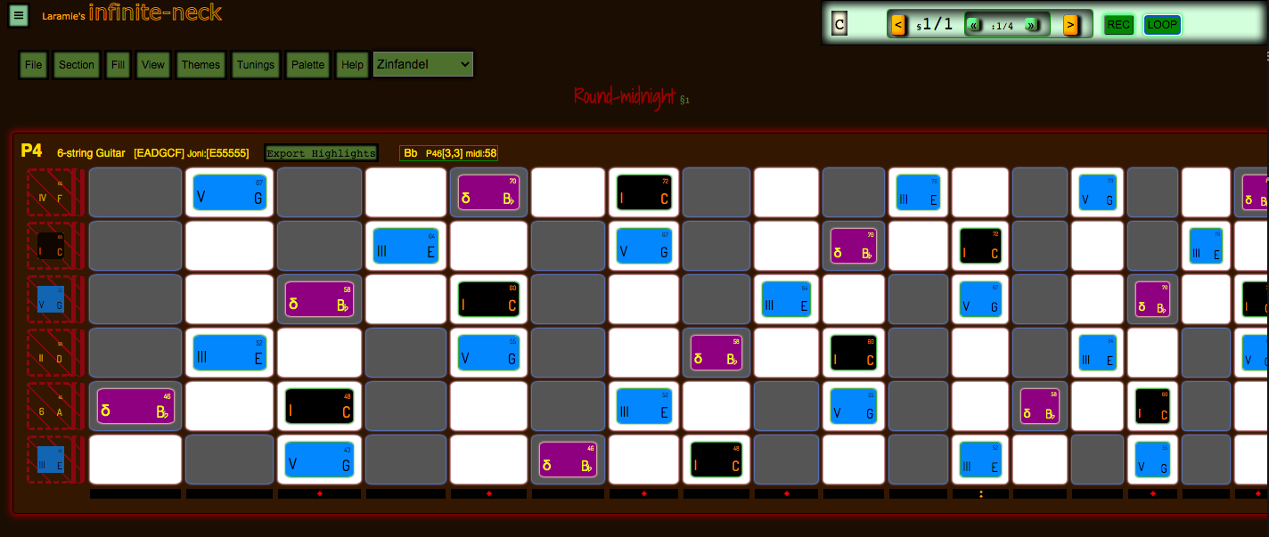 In a Funk jam, there are typically two Sections--when the bass player changes the Root, that would be the second Section, and when the Bass player goes back, we'd be back in the first section, regardless of whether we hung on the first Root for 8 bars. Alternately, some jams have two separate bass Root notes per bar, while the mode stays basically the same. These can be modeled as two Sections per bar. When you are placing notes in infinite-neck, you are looking at the neck in one Section. Within this section, as the Beats roll by, SingleNotes, TinyNotes, and Highlights can move around, but everything else stays the same. Specifically, the NamedNotes keep their positions for the entire Section. In one Section, the things that stay the same are: Caption, Root Key, Lead Root Key, Display Options, Theme, and the enharmonic display of key (A# versus G♭). When you go to the next Section, you get a new collection of recorded notes in Beats. That is, Section 1 could have two beats with up to 2 sets of recorded notes; Section 2 could have 16 beats with up to 16 sets of recorded notes. |