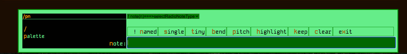 Or, the sequence: would put you at the top level, then go into fullscreen (logo, buttons, per-instrument buttons, and transport panel are all hidden), and choose as your kind of note for the next moment you click on a cell. You can verify this by looking at the Palette dialog. |