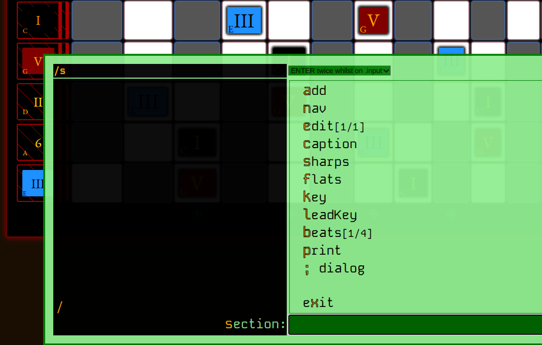 | /vd | view | diagnostics | Has a bunch of techie info about the song in memory in the browser, but can be useful. Feel free to poke around. None of the diagnostics do anything other than spit out a report at the bottom of the page below any instruments. |
