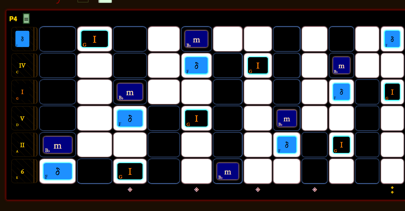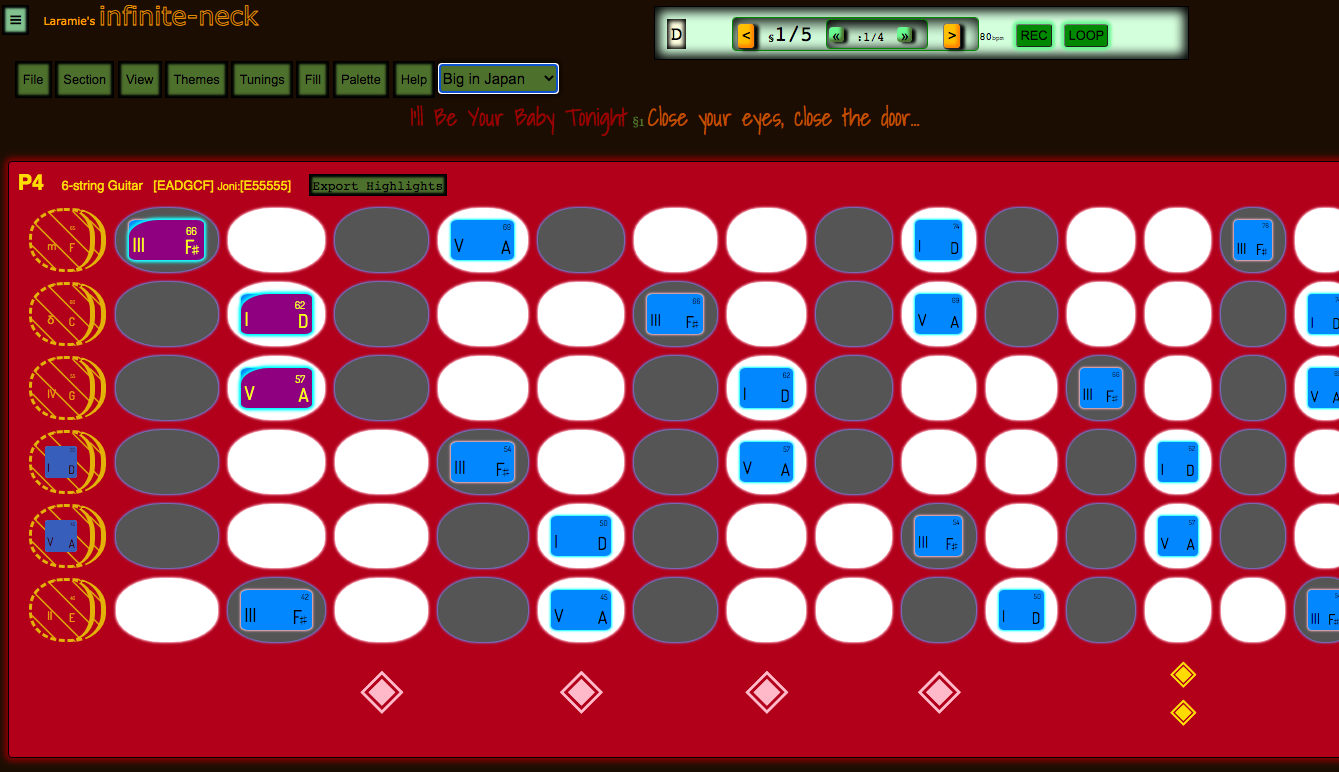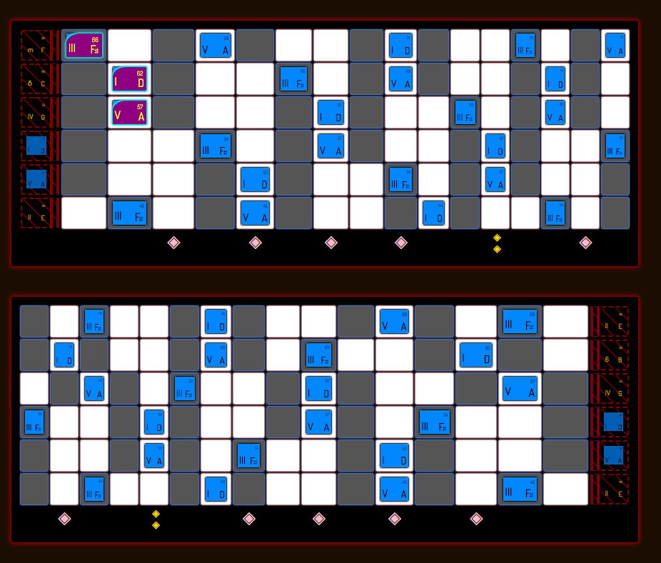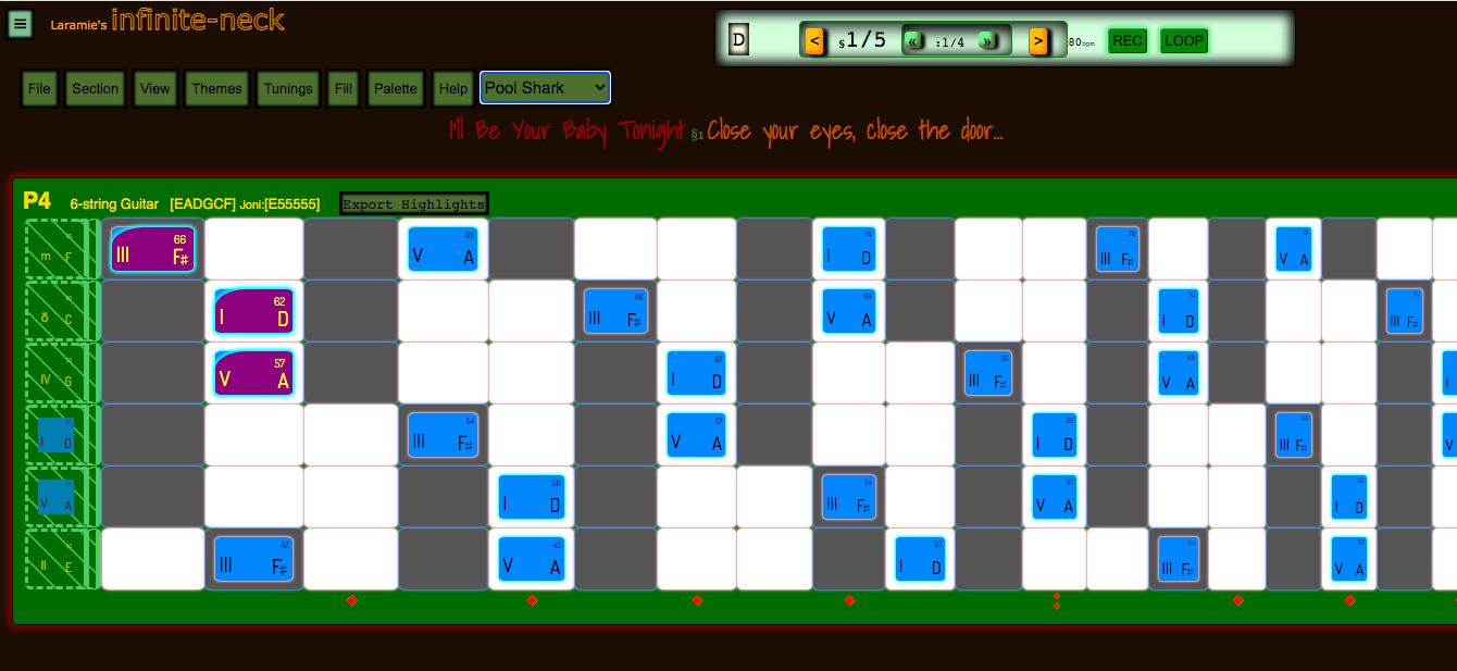 Or, with four Sections, the neck would look like a sea of bluish notes, and as each section is played, you'd see notes change style and color, forming one chord per Section with their color changes, that are different than the Dmin mood, and so draw your eyes to the chosen notes/positions within a whole fabric of playable notes. You can also add beats (Highlights) to these Sections for more expression.