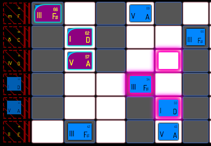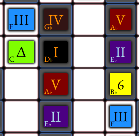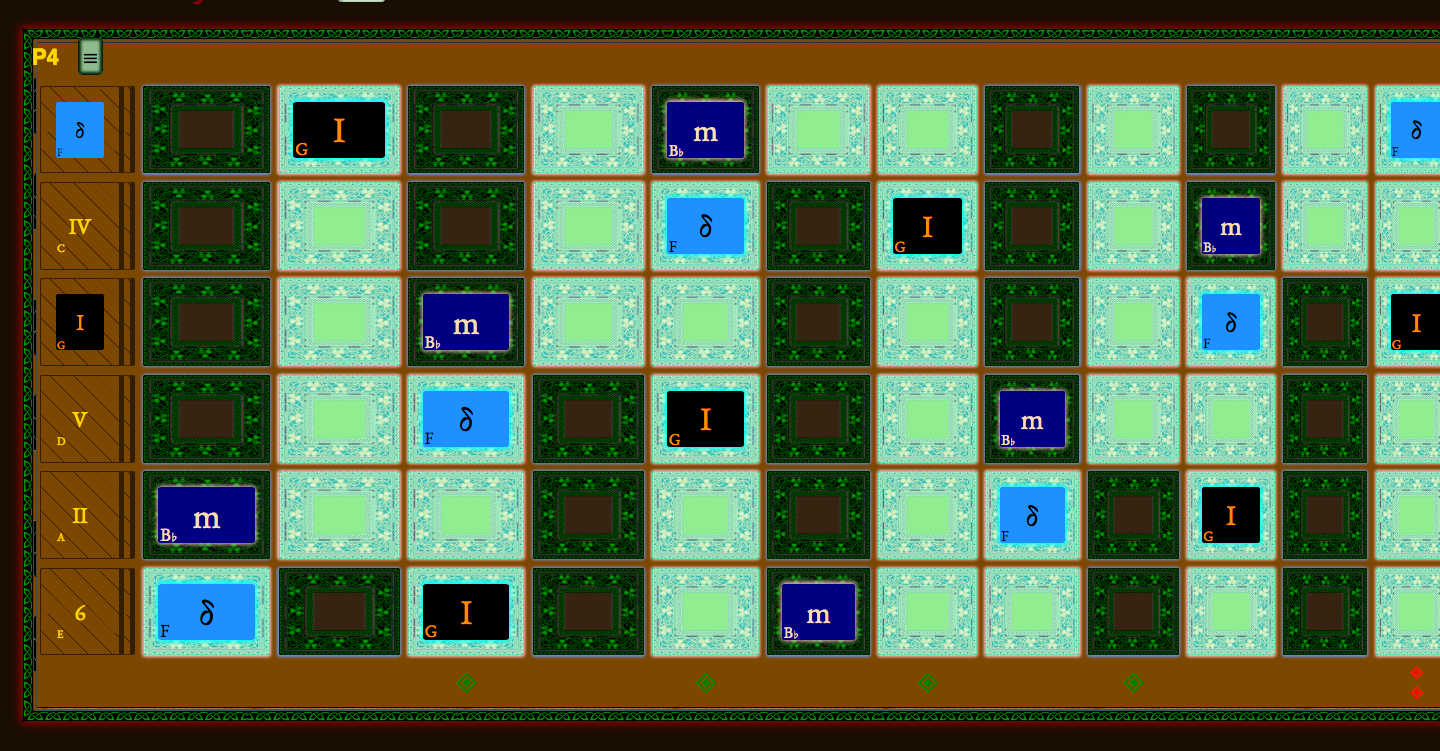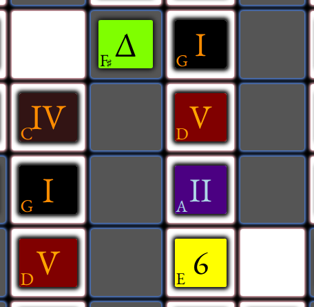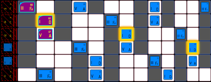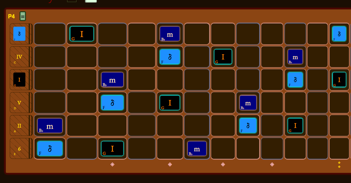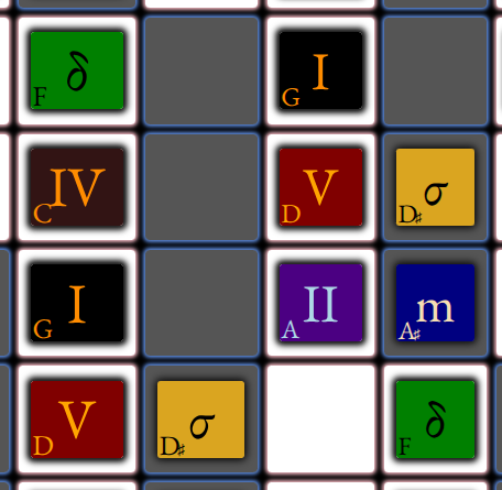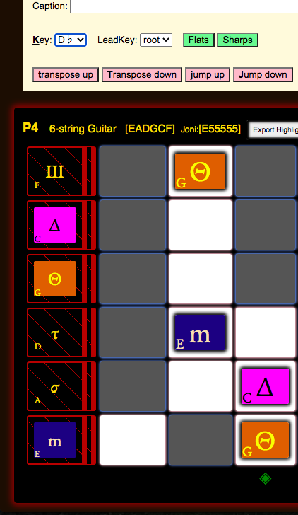 Or, with four Sections, the neck would look like a sea of bluish notes, and as each section is played, you'd see notes change style and color, forming one chord per Section with their color changes, that are different than the Dmin mood, and so draw your eyes to the chosen notes/positions within a whole fabric of playable notes. You can also add beats (Highlights) to these Sections for more expression.