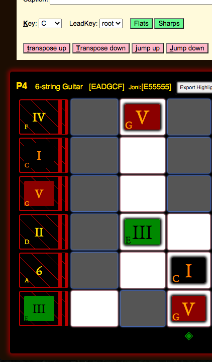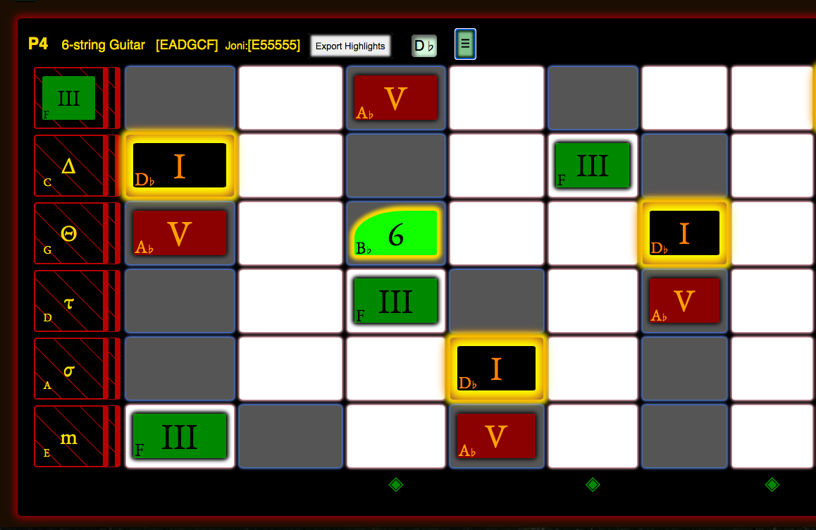I find it essential, when communicating with musicians, to "think Piano". So in addition to the note markers, or fret positions that you should play, should not play, could play...etc., I have styled the guitar necks with piano key coloring embeded as ivory and ebony box inlay, though in software they look more like lit-up MIDI controllers built into your guitar neck like Guitar Hero with half of Synthesia bolted on.