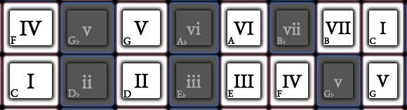 All note functions, root C shown in aqua, diatonic C-major notes in yellow, and black keys in gray with no notes,