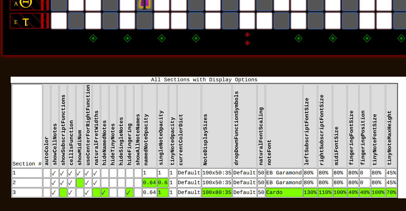 Some size options are not automated on playback if Presentation Mode is not checked. [Cell width, Cell height, NoteFontSize]. The idea is that changing the cell widths while looping would be annoying, but if you were presenting in a classroom, you might want to "zoom in" on a portion of the neck, so you'd change the cell width for that one Section, say, Section 2. Then, when you went from Section 1, where you show all possible notes for C Mixolydian, to Section 2, where you show just the first 5 frets on screen. You can set this all up in advance, so that in your presentation, all you need to do is hit the > key to advance through the example. When these get out of control or confusing, audit them with the keyboard command-line Scroll down to see the audit of all Sections with Display Options. The options that change are highlighted. You can also sit on the View page and watch the controls change while you hit the Transport next section buttons, or the keyboard shortcuts ( < and > ). Remember that if one of the controls traps the keyboard, click in some blank spot of the screen or hit ESC and then V to come back to the View menu. See more info in the Display Options context help topic. |