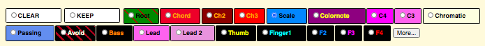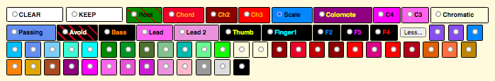 | Root/Chord/Scale - in Fill | Root would be the home note of the key of the bass player, Chord is the chord you want to play in this key, and Scale is the collection of notes that define that key or mode. Fill allows you to color these in different colors. So you could play in C, playing [C,D,E,F,G,A,B,C] and these would be the scale notes for Cmajor, with a Root of C. If you played [C,D,E,F,G,A,B♭,C] you could say you were playing C Mixolydian, so C is the Root, and these notes are the Scale notes. An appropriate Chord would then be C7 (C dominant 7). infinite-neck allows you to Fill the neck with NamedNotes using Chords and Scale notes (including modes) that are not necessarily in the key. So if you set the key to C, then fill with a m7b5 chord and Locrian scale, you'll notice that the m7b5 chord fits over the Locrian mode scale notes, but that most of these are not in C major scale. So really, you aren't in C major, but in C Locrian, and it works perfectly with a C m7b5. These are all available in the Fill menu dropdowns. |