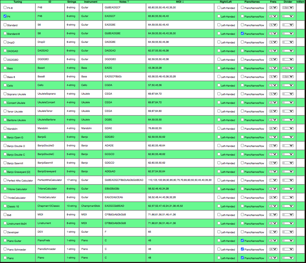 Here is the tunings table, which shows all tunings for all supported instruments. (It's easy to add your own tunings.)