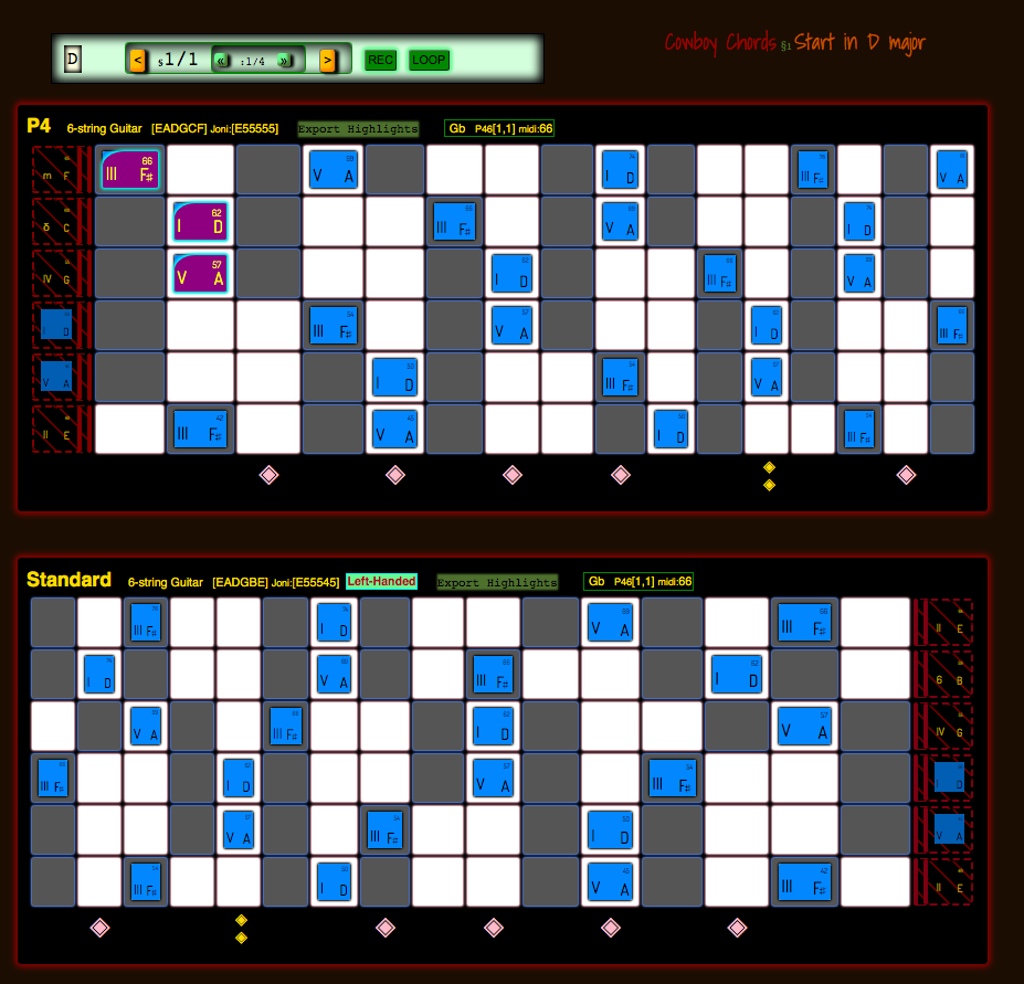Here are a P4-tuning 6-string guitar, and a Standard-tuning left-hand 6-string, both playing a cowboy-chord D-major, and showing those notes across the necks. They are in editing mode with titles and controls, and are displayed in the same workspace.